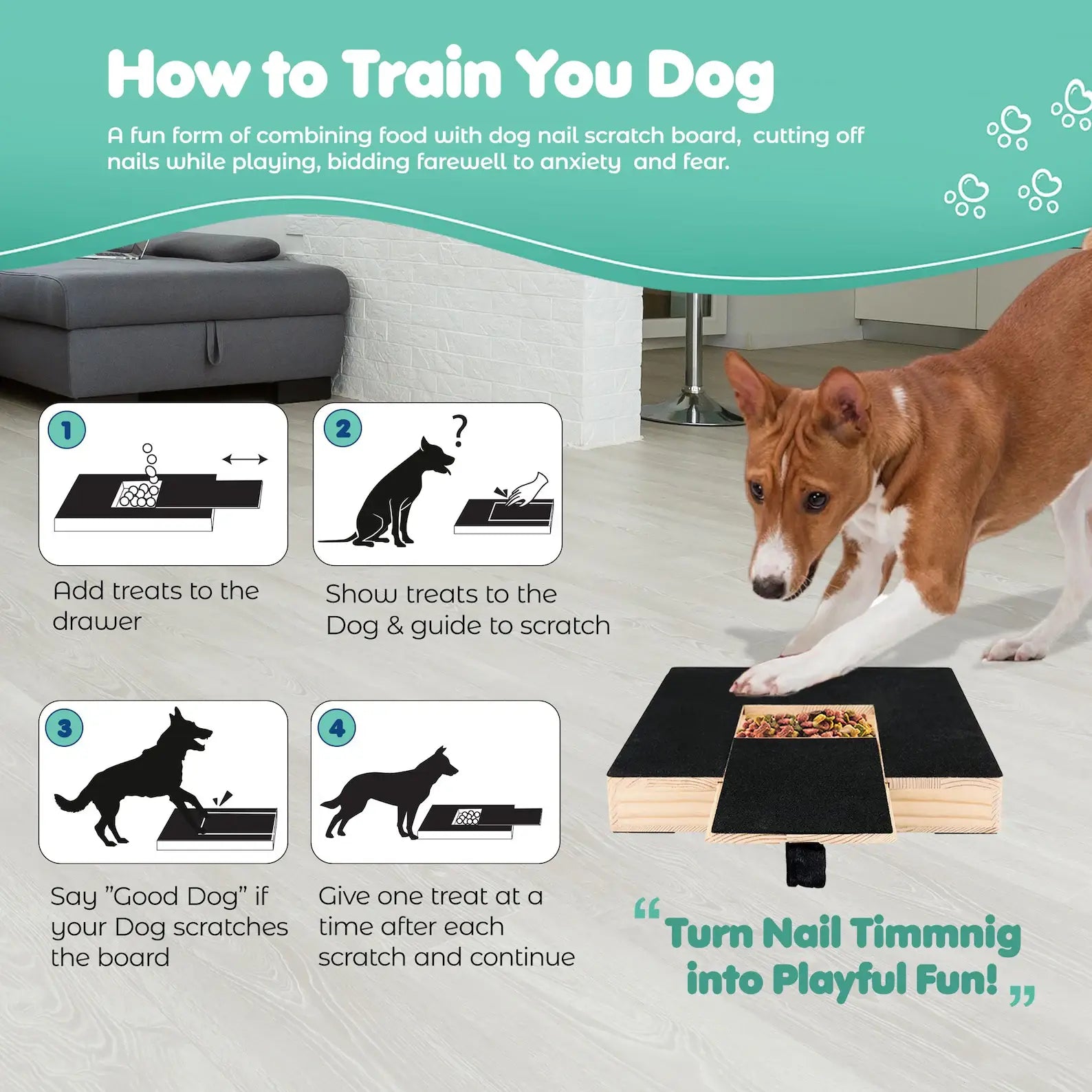 As your dog paws at the textured scratch surface to uncover hidden treats, the gentle friction keeps their nails trim and tidy — all without stress or struggle.